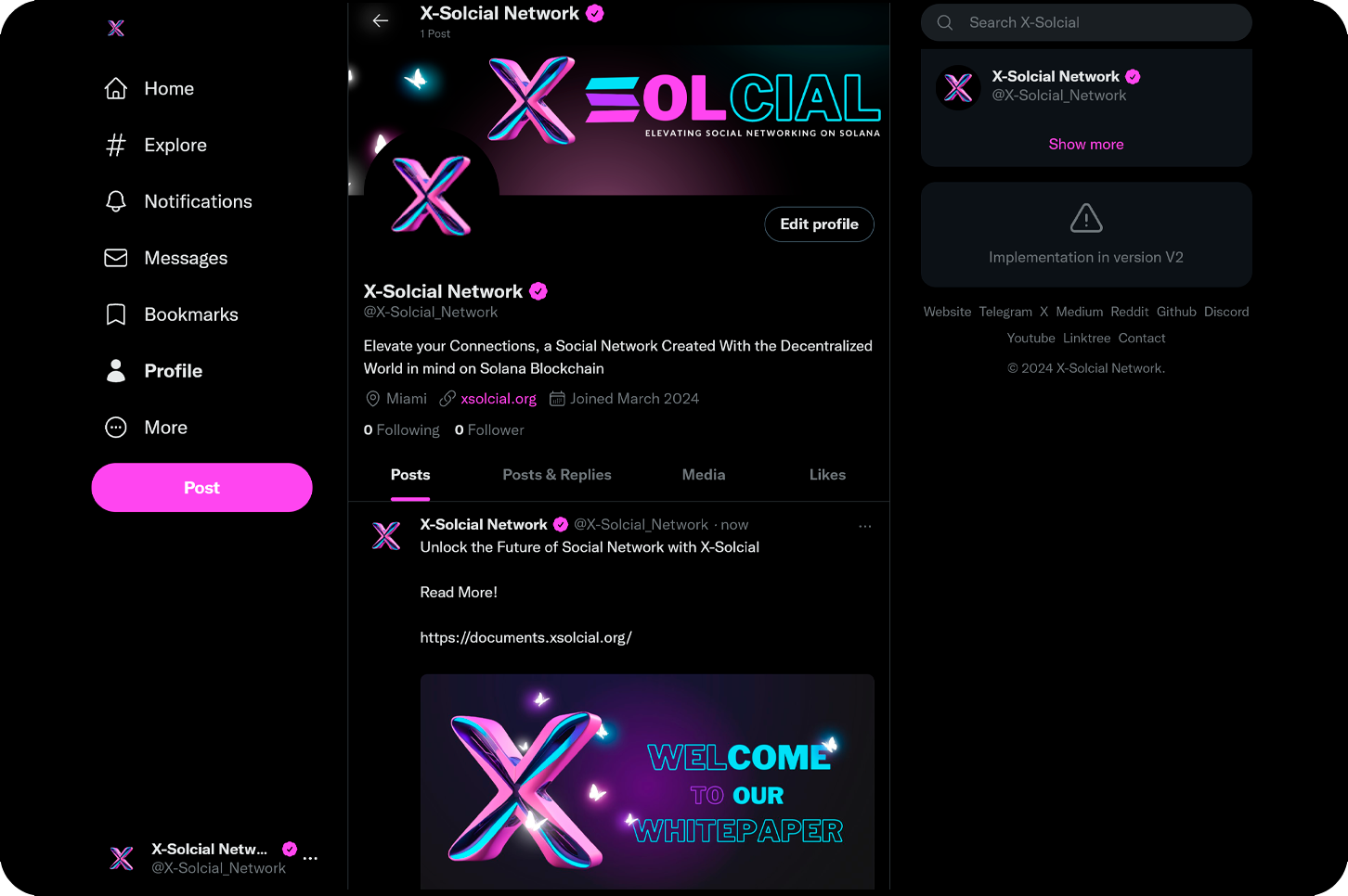 X-Solcial is a social communication network on the Solana blockchain, which offers a profile where you can post text, images, gifs, videos similar to Web2, but in a Web3 environment (Coming Soon). It uses the bases of a well-known social network and stores messages, text information, your publications. Privacy is a priority, with encrypted interactions and a simple interface to increase security.